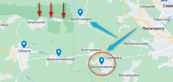 Альтернативный путь на Северск через Верхнекаменское может быть скоро заблокирован с захватом Верхнекаменки, где расположен Лисичанский НПЗ.