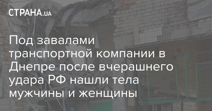 Под завалами транспортной компании в Днепре, куда вчера ударил российский "Калибр", нашли тела двух погибших.