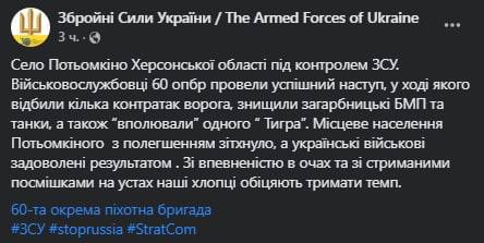 "Село Потемкино Херсонской области под контролем ВСУ. Военнослужащие 60 ОПБР провели успешное наступление, в ходе которого отбили несколько контратак врага, уничтожили БМП и танки, а также "поймали" одного "Тигра", - заявили ВСУ.