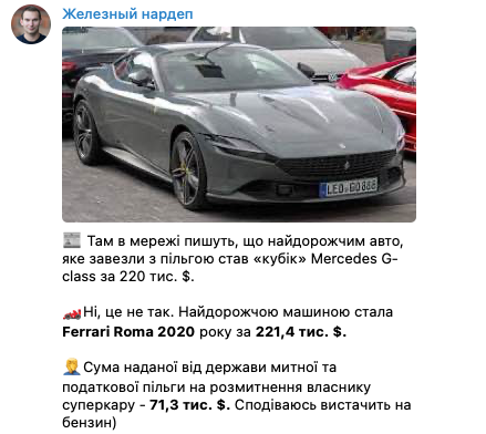 "Там в сети пишут, что самым дорогим авто, которое завезли по льготе стал "кубик" Mercedes G-class за $220 тысяч. Нет, это не так. Самой дорогой машиной стала Ferrari Roma за $221,4 тысячи", - говорится в сообщении.