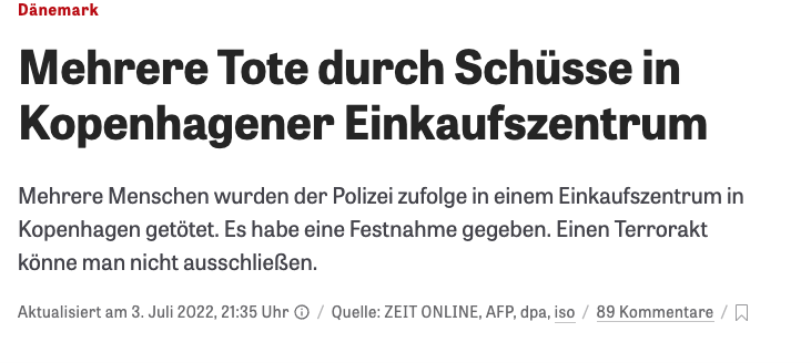 В Копенгагене 22-летний мужчина устроил стрельбу в торговом центре, убив несколько человек. Стрелок задержан, но точное количество пострадавших и погибших пока неизвестно.