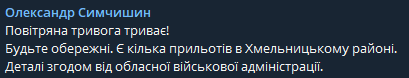 Мэр Хмельницкого Александр Симчишин сообщил о нескольких ракетных ударах по Хмельницкому району. Детали обещает позже