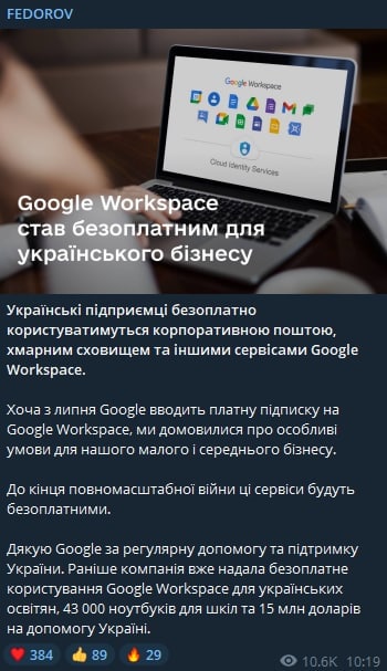 До конца войны сервисы Google Workspace (почта, облачное хранилище и т.д.) для малого и среднего бизнеса Украины будут бесплатными. Для всех остальных платная подписка вводится с июля.