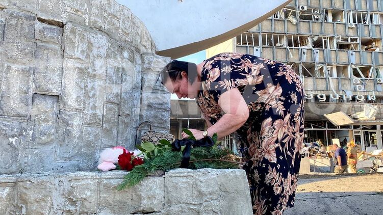 Между тем местные жители несут цветы к месту падения снаряда и гибели людей.