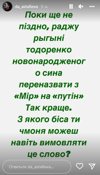"Пока еще не поздно, советую рыгыне тодоренко новорожденного сына переименовать из "Мир" в "путин". Так лучше. Какого черта, ты чмоня, можешь даже произносить это слово", – опубликовала пост в сети Астафьева.