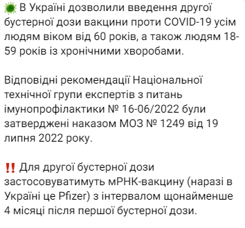 По данным Минздрава, вторую бустерную дозу можно будет вводить с интервалом не менее четырех месяцев после первой (третьей прививки). Для нее будут применять м-РНК- вакцину (в Украине сейчас доступна Comirnaty от Pfizer/BioNTech).