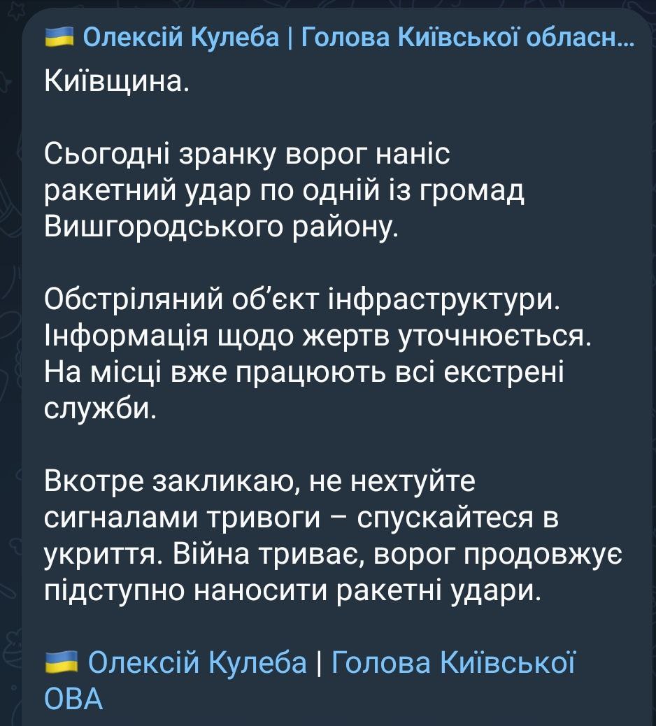 Под Киевом был прилет по Вышгородскому району. Есть попадание в объект инфраструктуры, сообщил губернатор Алексей Кулеба.