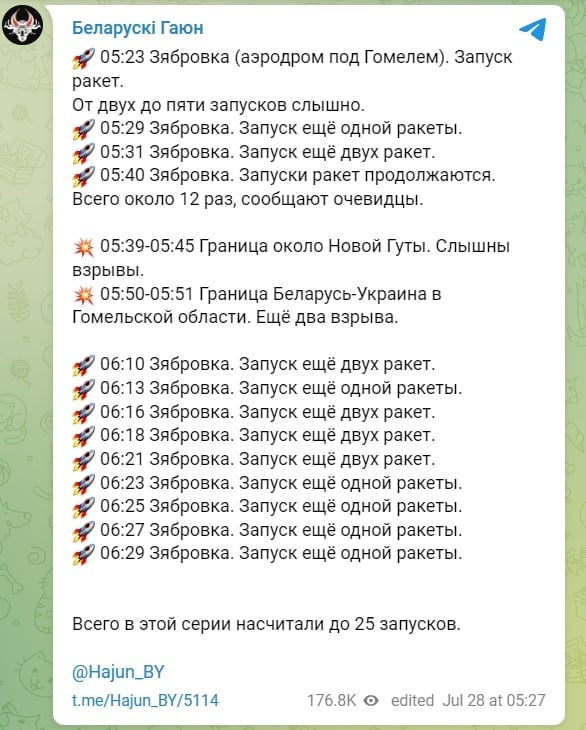 Телеграм-каналы пишут о том, что после этих сообщений были новые взрывы в Черниговской области. И что ракеты летят с территории Зябровки Гомельской области.