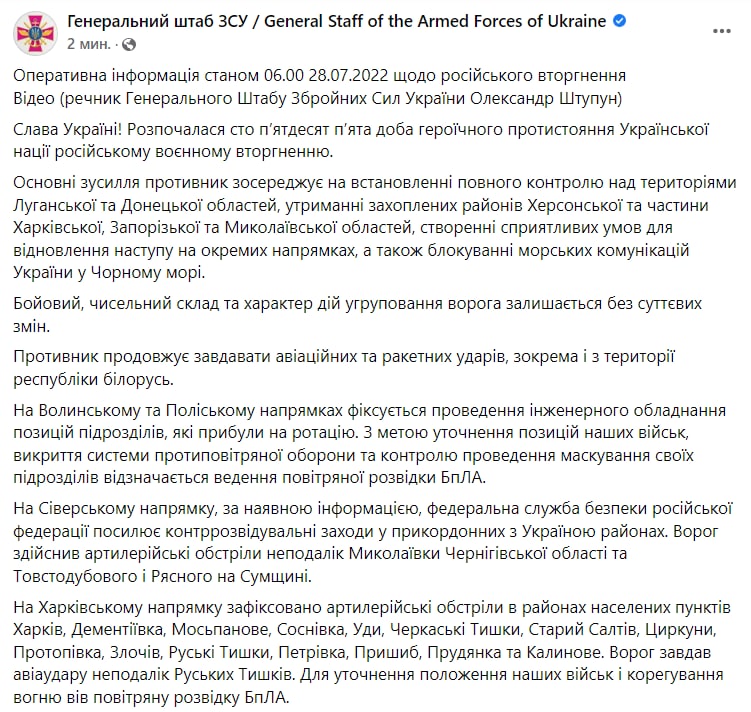 В четверг, 28 июля, в Украине идет 155-й день войны с Россией.