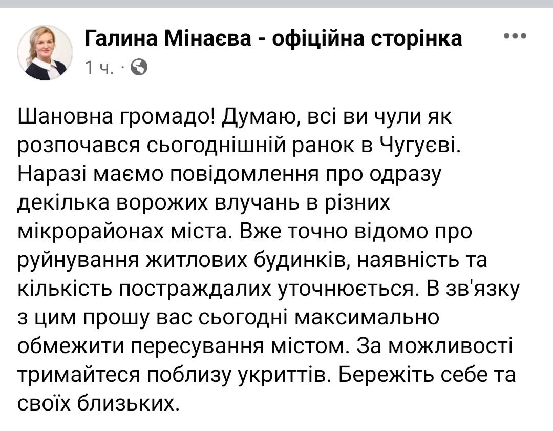 08:10 Мэр Чугуева Галина Минаева сообщила об ударах по разным микрорайонам города. Есть поврежденные жилые дома. Информация о пострадавших уточняется.
