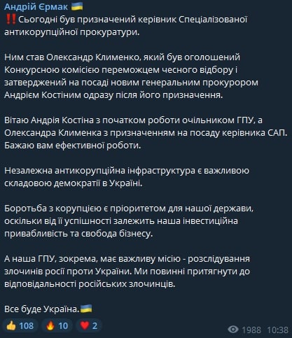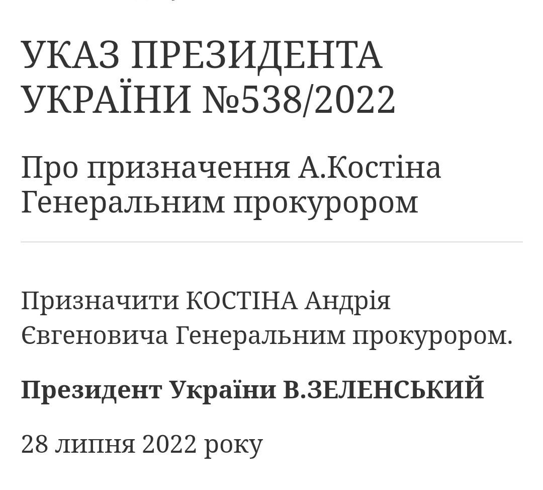 Он объявлен Конкурсной комиссией победителем отбора и утвержден в должности новым генеральным прокурором Андреем Костиным сразу после его назначения, сообщил глава ОП Андрей Ермак.