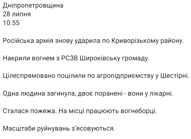 Российские войска в четверг, 28 июля, обстреляли Криворожский район Днепропетровской области. Под огнем оказалась Широковская громада. Пострадало агропредприятие.