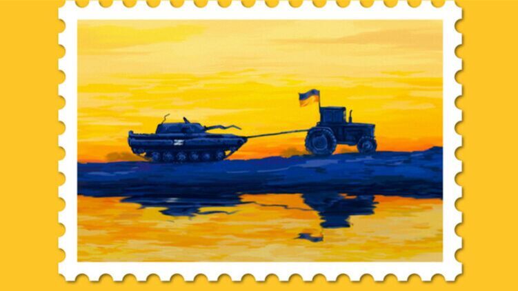 "Укрпочта" выпустила марку "Добрый вечер, мы из Украины", на которой трактор тащит танк РФ