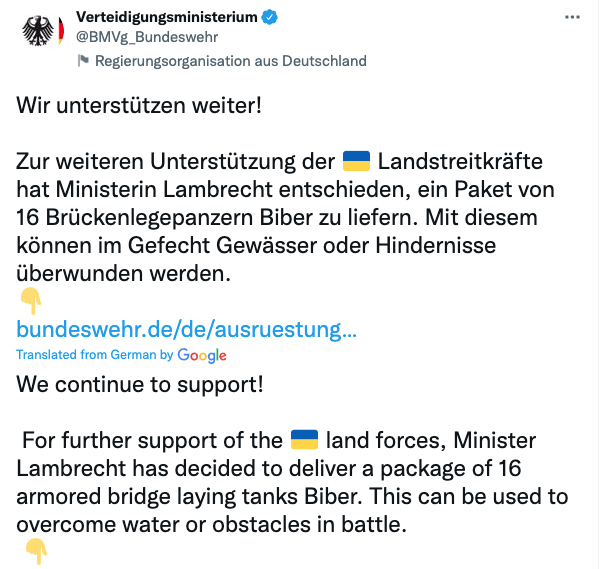 Германия передаст Украине 16 бронированных мостоукладчиков Biber, которые позволяют возводить мосты для преодоления водных или иных преград в бою.