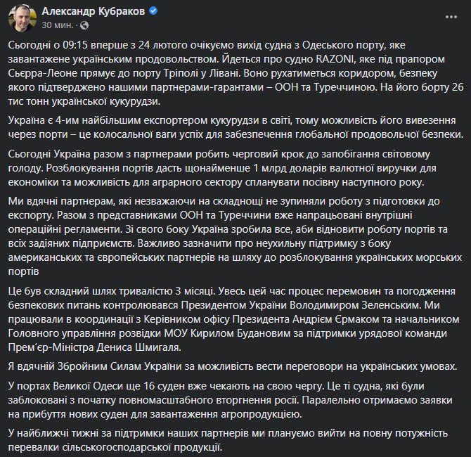 09:38 Первое судно с украинским зерном должно покинуть порт Одессы в 9:15, сообщил глава Мининфраструктуры Александр Кубраков.