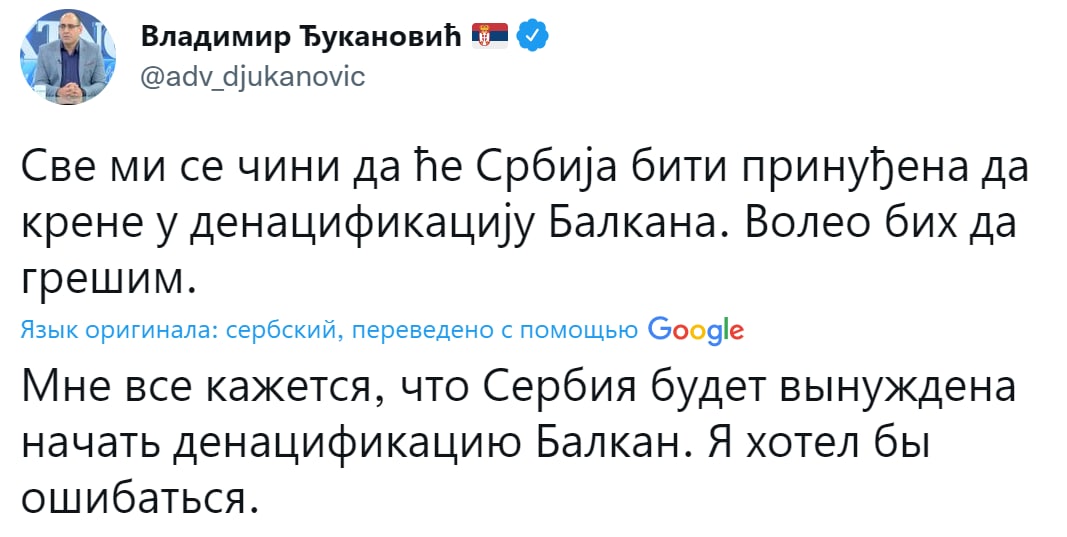 "Мне все кажется, что Сербия будет вынуждена начать денацификацию Балкан. Я хотел бы ошибаться", - написал политик в Твиттере.