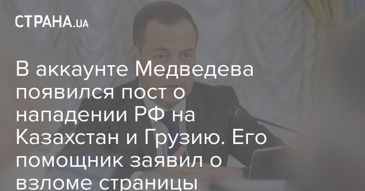 На ВК-странице зампредседателя Совбеза РФ Дмитрия Медведева появился пост о готовности РФ атаковать Казахстан и Грузию. Сообщение было оперативно удалено, а спустя время помощник Медведева заявил, что это фейк и страницу Медведева взломали.