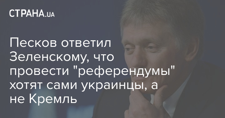 Пресс-секретарь президента РФ Дмитрий Песков ответил президенту Владимиру Зеленскому, что инициатива проведения "референдумов" о присоединении к РФ захваченных территорий Украины исходит от самих жителей этих регионов. А Кремль тут не при чем.