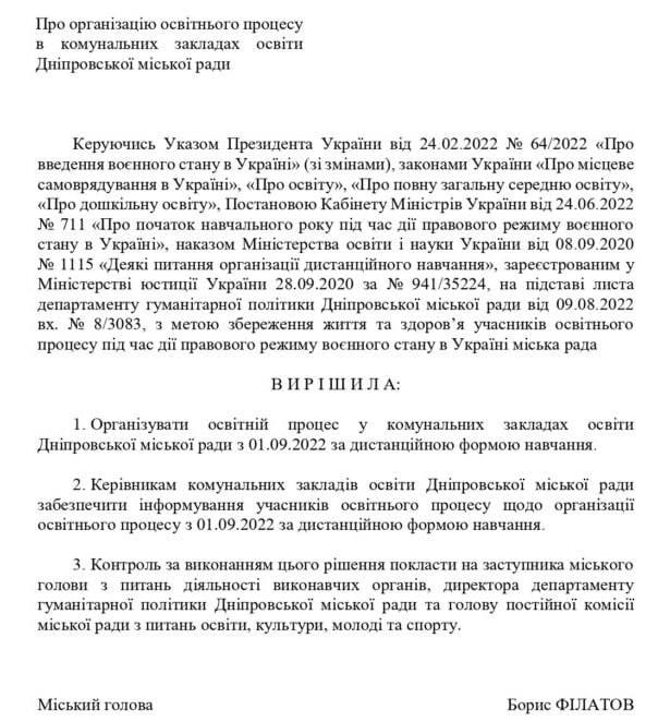 В проекте решения "Про организацию образовательного процесса в коммунальных учреждениях города" говорится, что с 1 сентября школы Днепра работают в дистанционном формате.