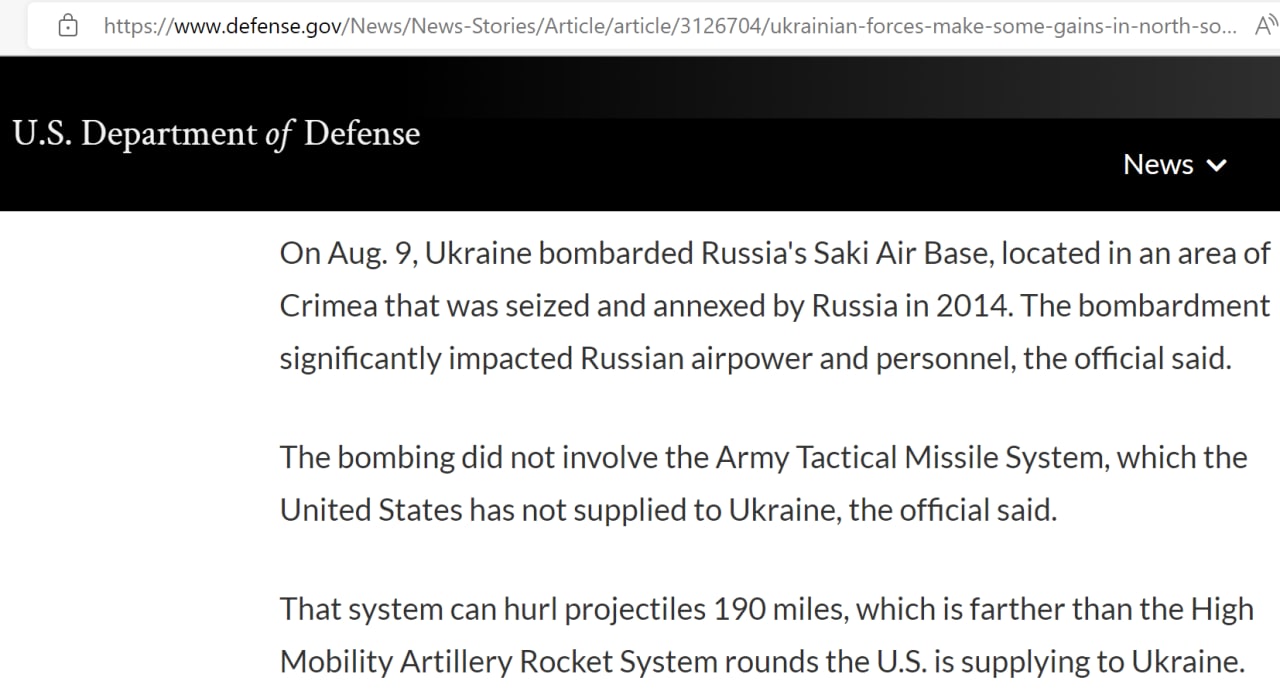 Со ссылкой на неназванного официального представителя военного ведомства США в сообщении на сайте говорится, что "9 августа Украина обстреляла российскую авиабазу Саки, расположенную в Крыму, который был захвачен и аннексирован Россией в 2014 году".