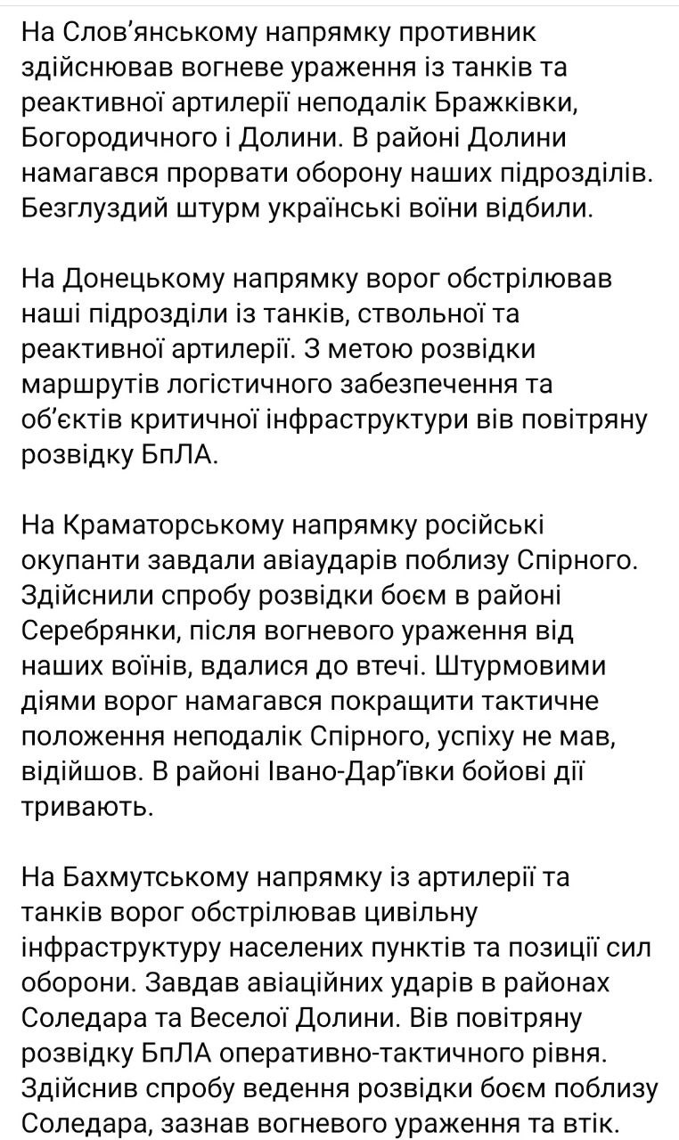 - На Краматорском направлении российские оккупанты нанесли авиаудары близ Спирного. Совершили попытку разведки боем в районе Серебрянки, после огневого поражения от наших воинов, прибегли к бегству. Штурмовыми действиями враг пытался улучшить тактическое положение недалеко от Спорного, успеха не имел, отошел. В районе Ивано-Дарьевки боевые действия продолжаются.