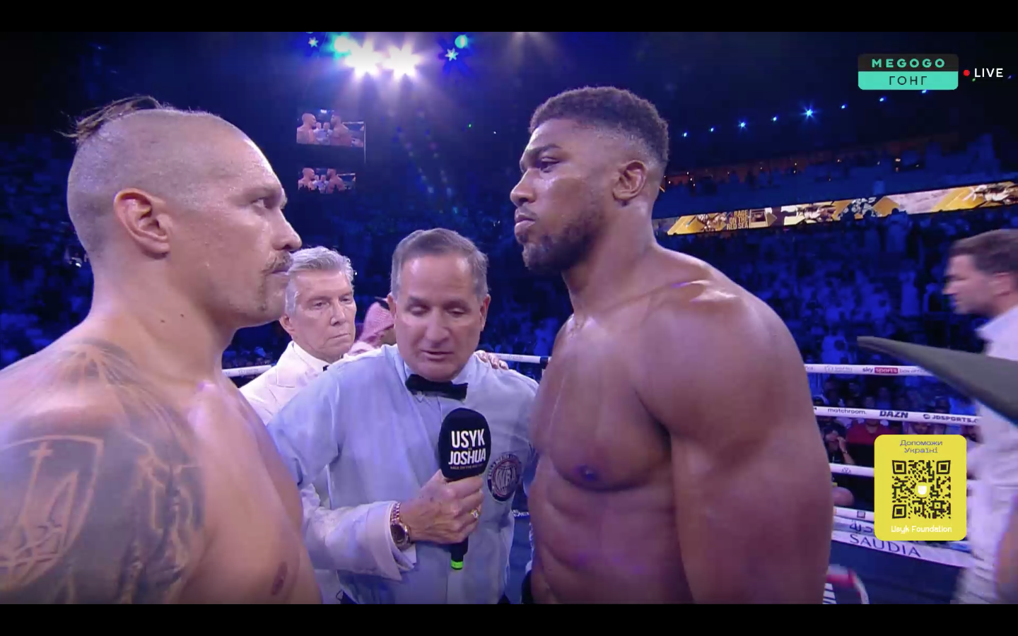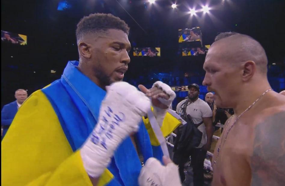 В своей длинной речи после боя Джошуа заявил, что в Украине есть чемпионы, несмотря на войну.  А Усик поблагодарил Бога и ВСУ.