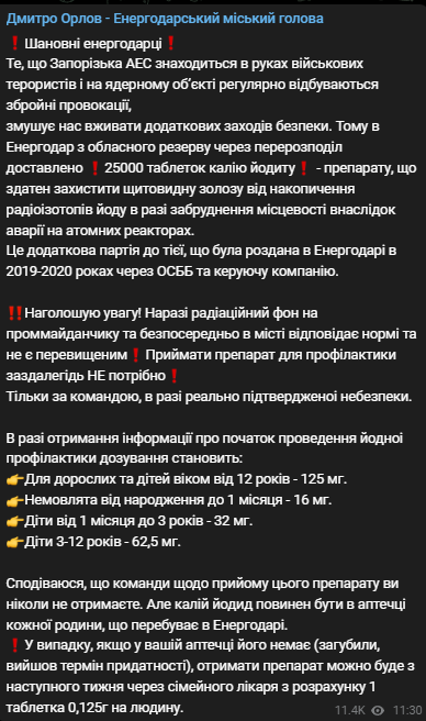 По его словам, радиационный фон на промплощадке Запорожской АЭС и непосредственно в городе соответствует норме. Принимать препарат для профилактики заранее не требуется, только по команде, в случае реально подтвержденной опасности.