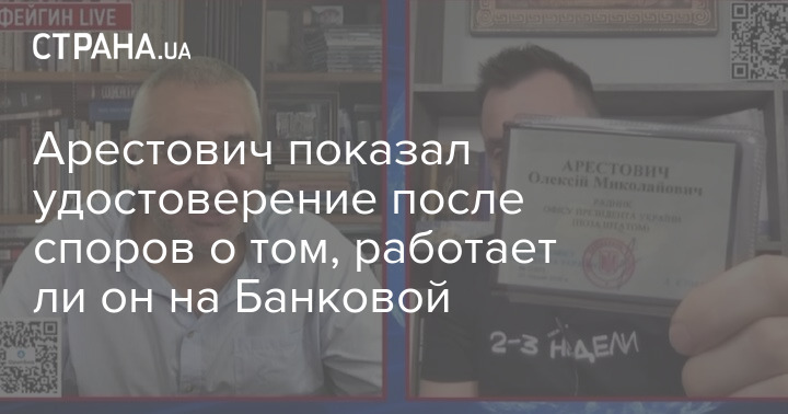 В продолжение вчерашних споров о том, работает ли Арестович на Банковой, он показал свое удостоверение внештатного советника Офиса президента в эфире у Марка Фейгина.