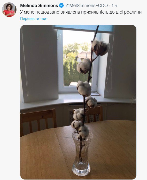 20:01 Посол Великобритании в Украине Мелинда Симмонс опубликовала в Twitter фото ветки хлопка и написала, что с недавних пор имеет склонность к этому растению.