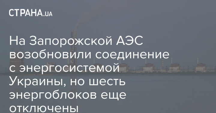 Запорожская атомная электростанция возобновила соединение по четвертой линии связи с энергосистемой Украины. Однако все шесть энергоблоков АЭС остаются отключенными.