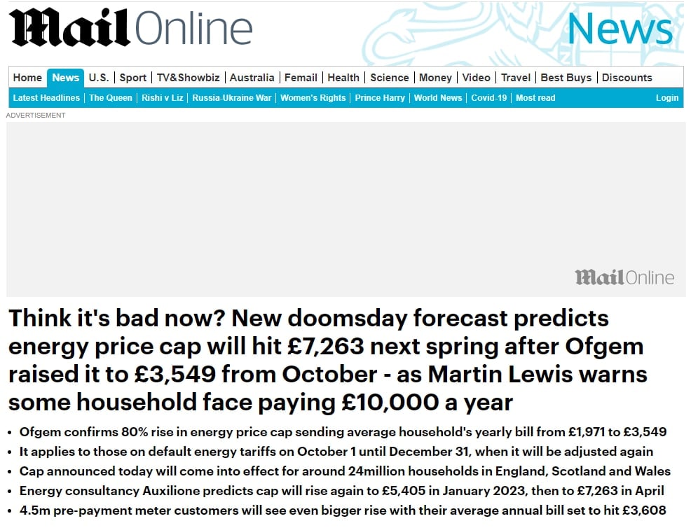 "Думаете сейчас плохо? Новый прогноз конца света предсказывает, что предел цен на энергоносители достигнет 7 263 фунтов стерлингов следующей весной после того, как регулятор поднял его до 3 549 фунтов стерлингов с октября. Как предупреждает Мартин Льюис (член общества защиты прав потребителей), некоторые домохозяйства будут платить 10 000 фунтов стерлингов в год", - пишет издание.
