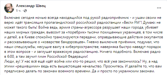 "Думаю: не может такого быть! Война ведь, армия страны-агрессора разрушает наши города, убивает наших мирных граждан, вывозит за "поребрик" тысячи похищенных украинцев, в том числе и детей, а в Киеве спокойно транслируются передачи, оправдывающие действия оккупантов и рассказывающие о "коварстве бандэровцев". Гневно выключив приёмник, подумал, что наши спецслужбы, несущие вахту в киберпространстве, наверняка быстро наведут порядок в этом вопросе - и заглушат вражескую радиостанцию. Ничего подобного. Включаю радио в 6:00, а там звучит гимн Российской Федерации!", - рассказывает Швец.