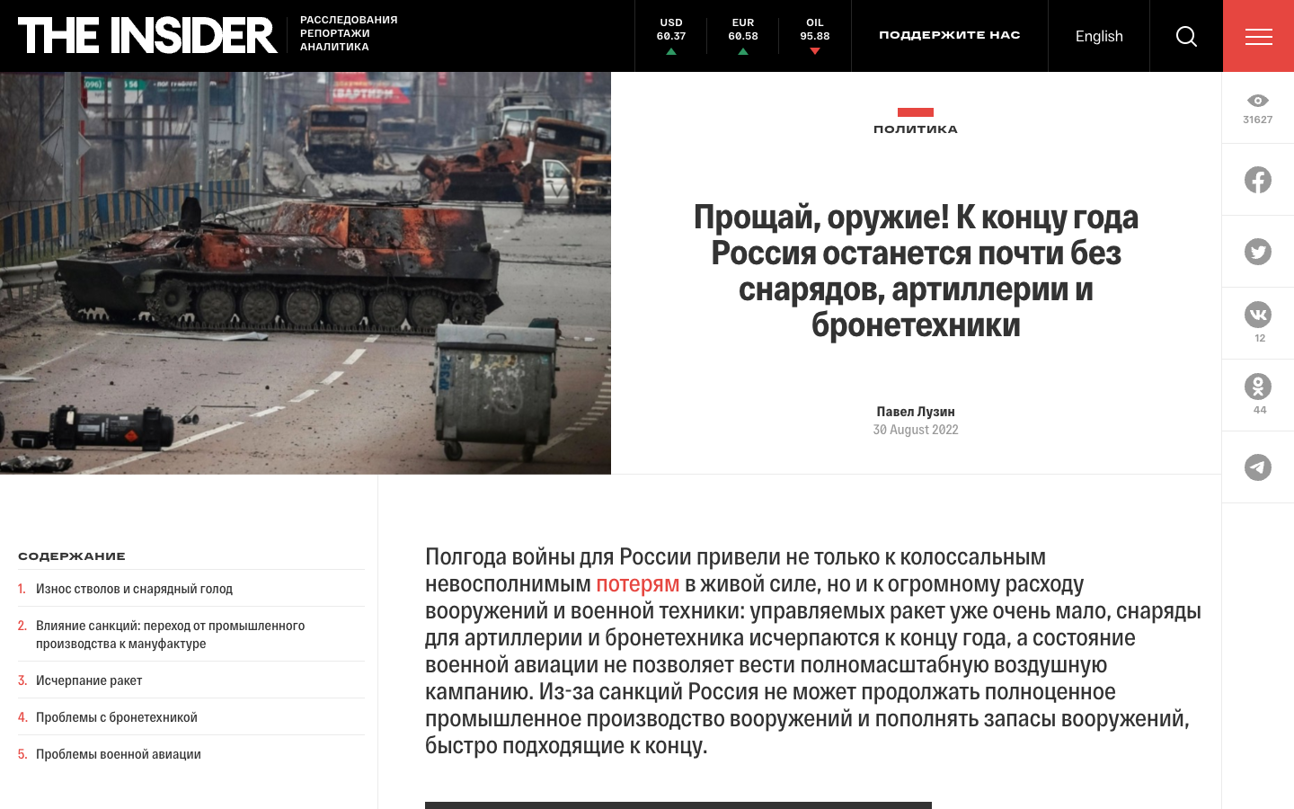 "Полгода войны для России привели не только к колоссальным невосполнимым потерям в живой силе, но и к огромному расходу вооружений и военной техники: управляемых ракет уже очень мало, снаряды для артиллерии и бронетехника исчерпаются к концу года, а состояние военной авиации не позволяет вести полномасштабную воздушную кампанию", - пишет издание.