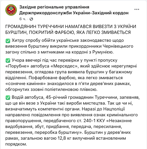 На границе с Румынией украинские правоохранители пресекли попытку незаконного вывоза янтаря под видом картин из крашеной гальки.