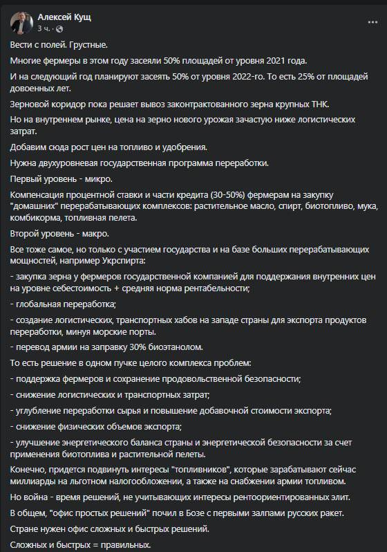 "Зерновой коридор пока решает вывоз законтрактованного зерна крупных транснациональных корпораций. На внутреннем рынке, цена на зерно нового урожая зачастую ниже логистических затрат. Добавим сюда рост цен на топливо и удобрения", - перечисляет Кущ проблемы фермеров.