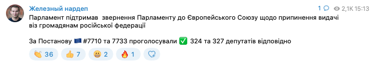 Как сообщил нардеп Ярослав Железняк, соответствующие постановления №7710 и №7733 поддержали 324 и 327 депутатов соответственно.