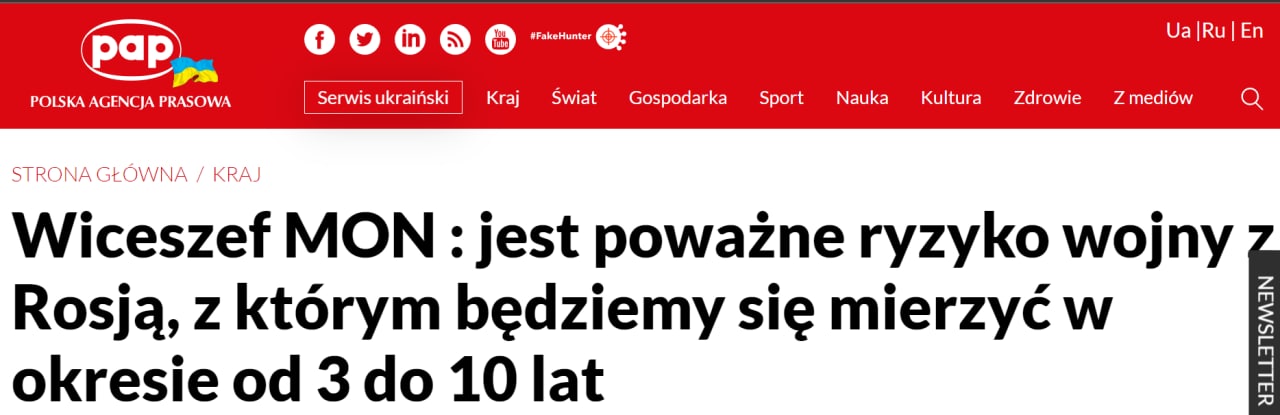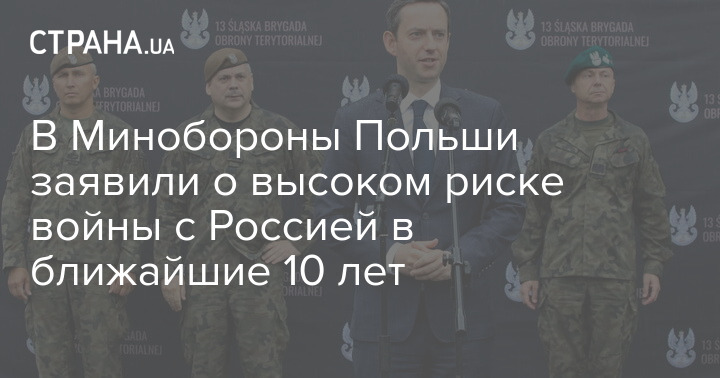 Замминистра обороны Польши Марцин Оцепа заявил, что существует серьезный риск войны Польши с Россией в период от 3 до 10 лет, поэтому необходимо максимально подготовить польскую армию.