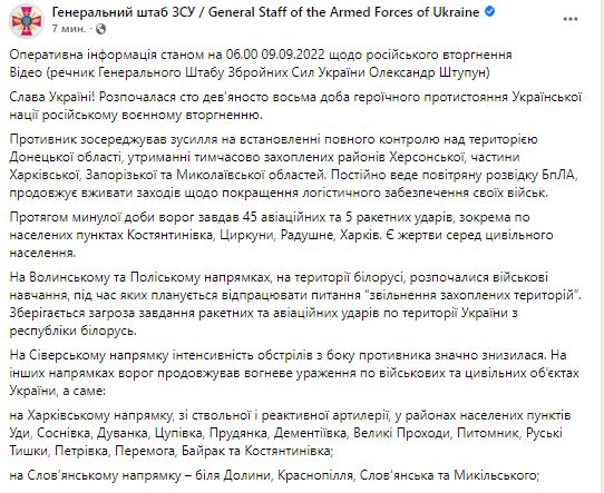 5. За прошедшие сутки враг нанес 45 авиационных и 5 ракетных ударов, в том числе по населенным пунктам Константиновка, Циркуны, Радушное, Харьков. Есть жертвы среди гражданского населения.