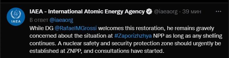 "Гендиректор Рафаэль Гросси приветствует новость о восстановлении электроснабжения, но по-прежнему серьезно озабочен ситуацией на ЗАЭС на фоне продолжения обстрелов. Необходимо срочное создание вокруг ЗАЭС охранной зоны ядерной и физической безопасности, начаты консультации", - сообщается в твиттере агентства.