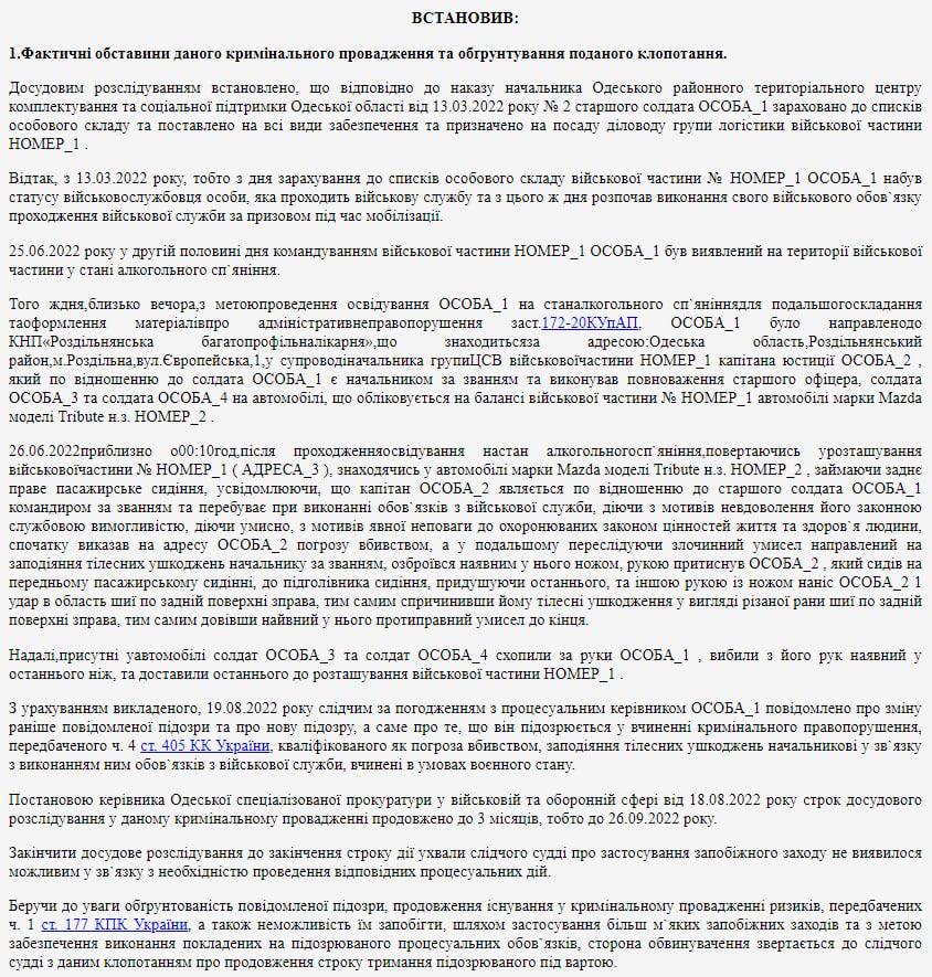 В Одессе мобилизованный мужчина пытался убить капитана, говорится в судебном решении, опубликованном в Едином реестре.
