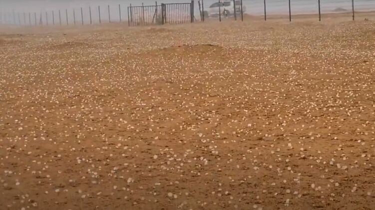 В ролике запечатлена пустыня, густо усеянная ледяными шарами града.