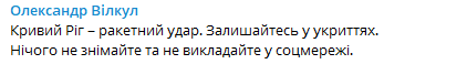 Сегодня, 14 сентября, Кривой Рог подвергся ракетному удару. Об этом сообщил руководитель военной администрации Кривого Рога Александр Вилкул в своем телеграм-канале.