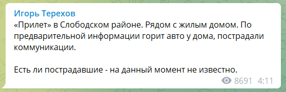 По предварительной информации, в результате загорелось авто у дома и пострадали коммуникации. Информация о пострадавших уточняется.