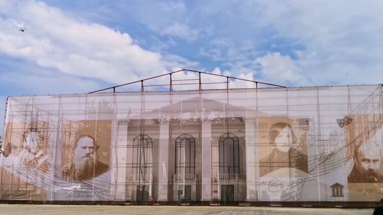 Появились фото Мариупольского драмтеатра, вокруг которого сейчас ставят леса с портретами классиков украинской и русской литературы.