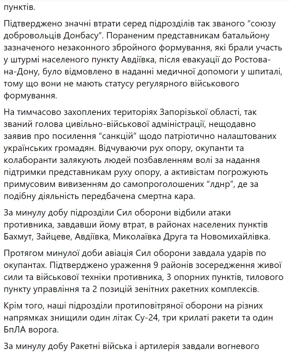 За минувшие сутки враг нанес 4 ракетных, 24 авиационных удара и совершил 72 обстрела из систем реактивной артиллерии.