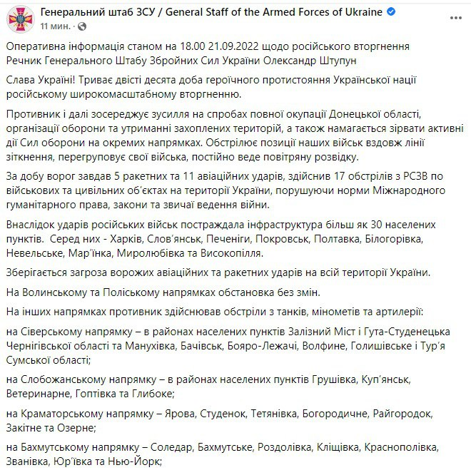 В среду, 21 сентября, идет 210-й день полномасштабного российского вторжения в Украину.