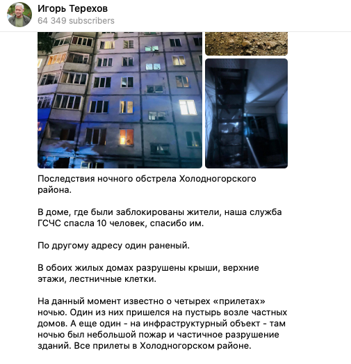 Мэр Харькова Игорь Терехов рассказал о последствиях ночного обстрела Холодногорского района Харькова. В многоквартирном доме после удара были заблокированы жители, спасатели ГСЧС вывели оттуда 10 человек.