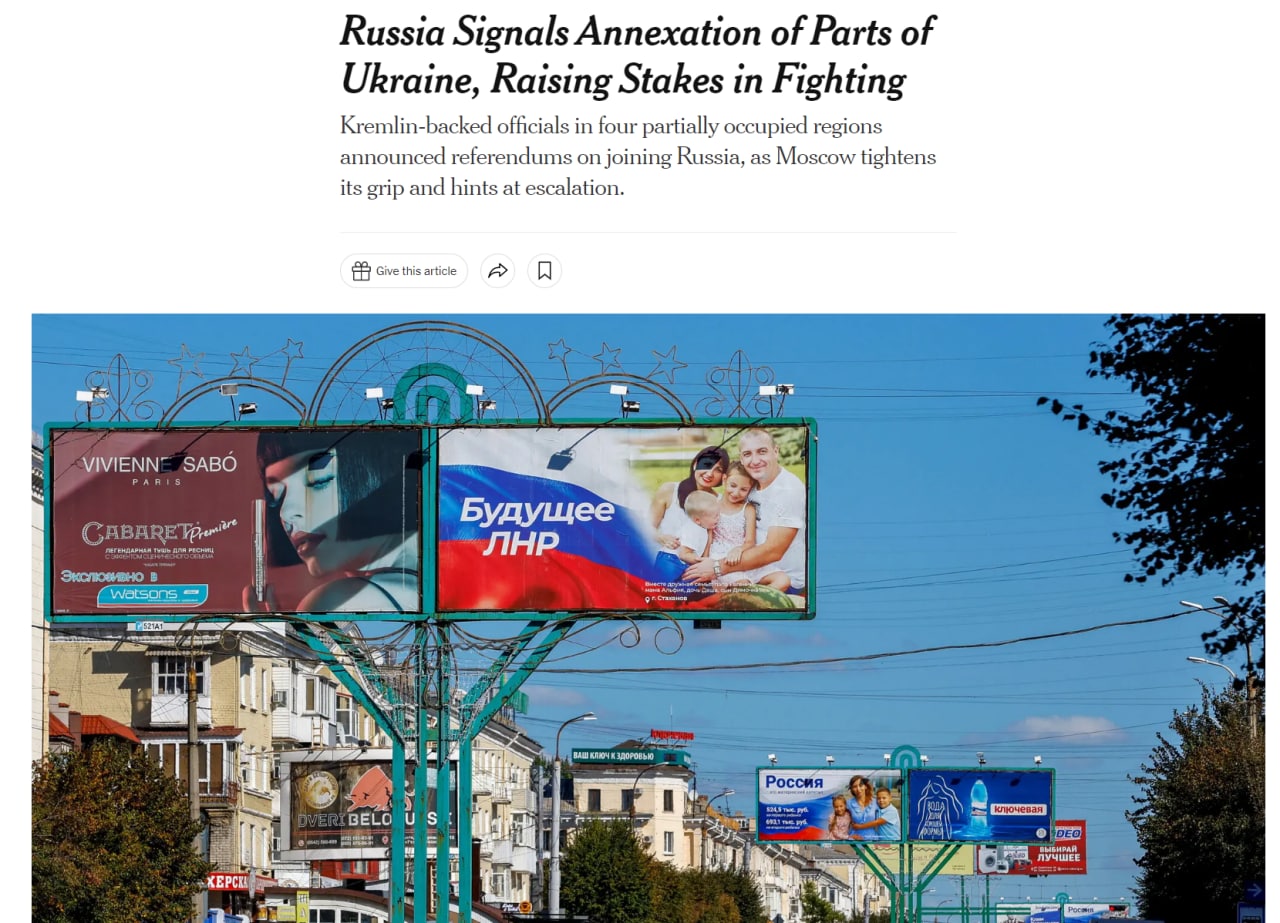Газета The New York Times выделяет три объяснения, почему Россия решила провести "референдумы" на захваченных ей территориях.