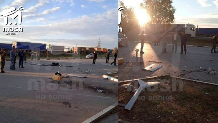 Дрон упал возле входа в продуктовый магазин, территория вокруг оцеплена. Фото: Mash