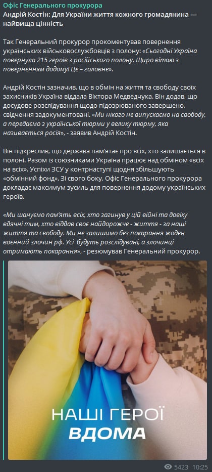 "Государство помнит обо всех, кто остается в плену. Вместе с союзниками Украина работает над обменом всех на всех. Успехи ВСУ в контрнаступлении ежедневно увеличивают обменный фонд. Со своей стороны Офис генерального прокурора прилагает максимум усилий для возвращения домой украинских героев", - заявил Костин.